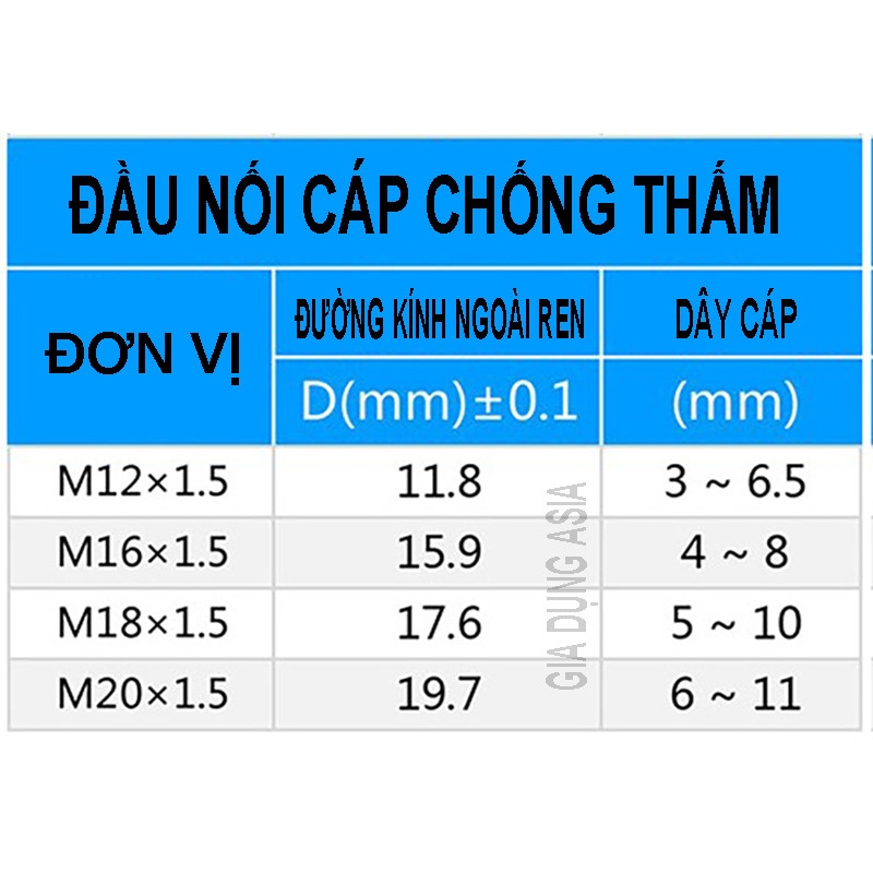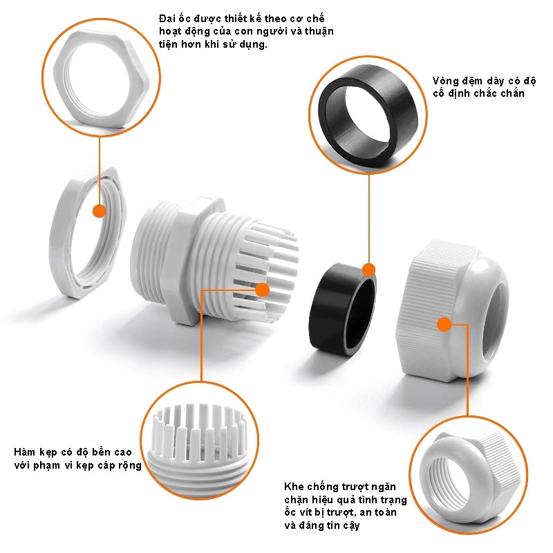 Đầu nối cáp chống nước (hay còn gọi là ốc siết cáp, cable gland) là phụ kiện thiết yếu giúp bảo vệ các mối nối dây điện khỏi tác động của môi trường, đặc biệt là chống thấm nước và bụi bẩn, đảm bảo an toàn và độ bền cho hệ thống điện. Sản phẩm trong hình là loại đầu nối cáp chống nước M12, M16, M18, M20, được làm từ chất liệu nylon, với hai màu sắc phổ biến là đen và trắng.Đặc điểm nổi bật:Chống thấm nước và bụi bẩn hiệu quả: Với thiết kế chuyên dụng và gioăng cao su bên trong, đầu nối cáp giúp ngăn chặn sự xâm nhập của nước và bụi theo tiêu chuẩn IP (thường là IP67 hoặc IP68), bảo vệ an toàn cho các kết nối điện bên trong.Chất liệu Nylon bền bỉ: Nylon (PA66) là vật liệu có độ bền cơ học cao, chịu được va đập, chống ăn mòn và có khả năng cách điện tốt, phù hợp cho cả ứng dụng trong nhà và ngoài trời.Kích thước ren tiêu chuẩn M12, M16, M18, M20: Đây là kích thước ren phổ biến, phù hợp với nhiều loại cáp điện và lỗ khoét trên thiết bị, hộp nối. Con số "M20" chỉ đường kính ren danh nghĩa là 20mm, và "1.5" là bước ren 1.5mm.Thiết kế chắc chắn, dễ lắp đặt: Đầu nối cáp có cấu tạo gồm các bộ phận giúp siết chặt và cố định cáp điện một cách chắc chắn, đảm bảo cáp không bị tuột hoặc lỏng lẻo trong quá trình sử dụng. Việc lắp đặt cũng tương đối đơn giản và nhanh chóng.Đa dạng kích cỡ cáp tương thích: Đầu nối M12, M16, M18, M20 thường phù hợp với các loại cáp có đường kính như sau:M12x1.5: Đường kính ren ngoài 11,8mm / Dây cáp 3~6,5mmM16x1.5: Đường kính ren ngoài 15,9mm / Dây cáp 4~8mmM18x1.5: Đường kính ren ngoài 17,6mm / Dây cáp 5~10mmM20x1.5: Đường kính ren ngoài 19,7mm / Dây cáp 6~11mmMàu sắc lựa chọn: Sản phẩm có sẵn màu đen và trắng, giúp người dùng dễ dàng lựa chọn cho phù hợp với thẩm mỹ của thiết bị hoặc công trình.Ứng dụng:Đầu nối cáp chống nước M12, M16, M18, M20 được sử dụng rộng rãi trong nhiều lĩnh vực khác nhau, bao gồm:Hệ thống điện công nghiệp: Tủ điện, hộp điều khiển, động cơ, máy móc thiết bị.Chiếu sáng ngoài trời: Đèn đường, đèn pha, đèn trang trí sân vườn.Năng lượng mặt trời: Hộp nối (junction box) của tấm pin mặt trời, biến tần (inverter).Thiết bị hàng hải và các ứng dụng ven biển.Các ứng dụng cần đảm bảo độ kín khít, chống ẩm cho mối nối điện.Với những ưu điểm vượt trội về khả năng bảo vệ và độ bền, đầu nối cáp chống nước M12, M16, M18, M20 là lựa chọn lý tưởng để đảm bảo an toàn và ổn định cho các kết nối điện trong nhiều môi trường hoạt động khác nhau.