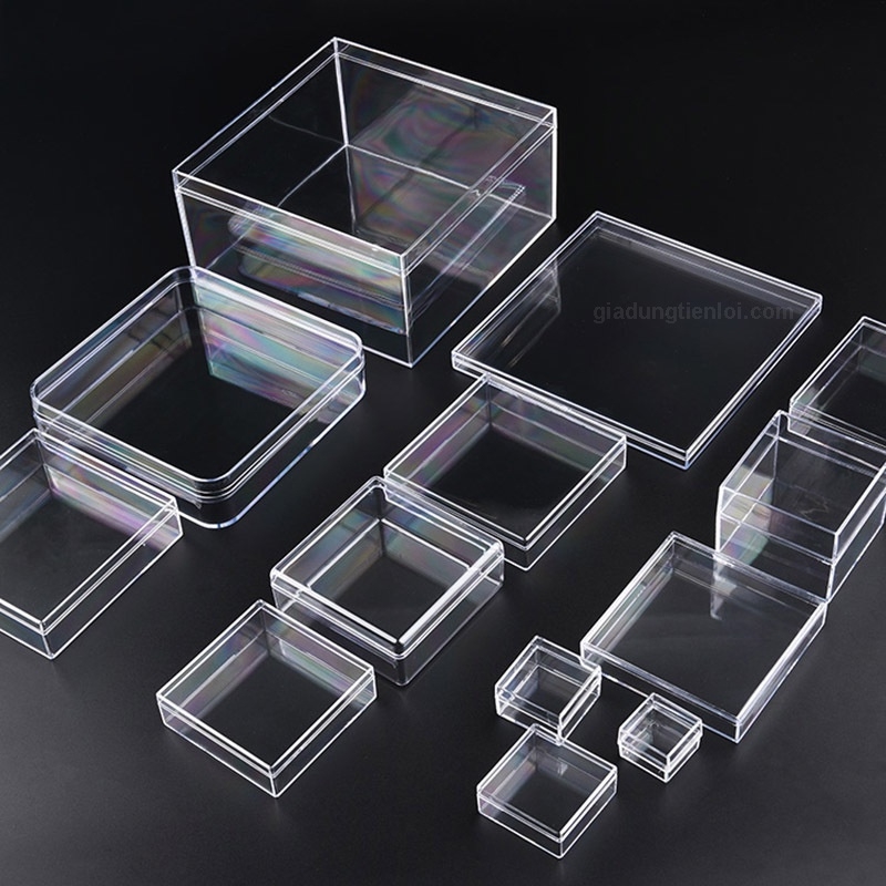 Hộp mica trong suốt đựng trang sức,quà tặng, huy hiệu sử dụng cho các mục đích khác nhau.Kích thước:28*28*20MM (ĐẾ ĐEN - nắp vỏ sò)30*30*22MM (nắp rời)40*40*24MM (nắp rời)42*42*20MM (ĐẾ ĐEN - nắp vỏ sò)50*50*20MM (nắp rời)56*40*20MM (nắp rời)85*65*25MM (nắp rời)85x85x30MM (nắp rời)85x85x50MM (nắp rời)Chất liệu: nhựa PS