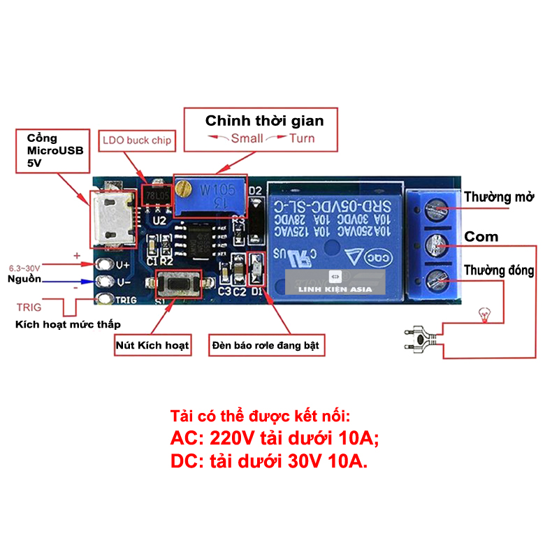 5. Module có thể điều khiển: 10A 250VAC (AC), 10A 30VDC (DC) dưới tải.