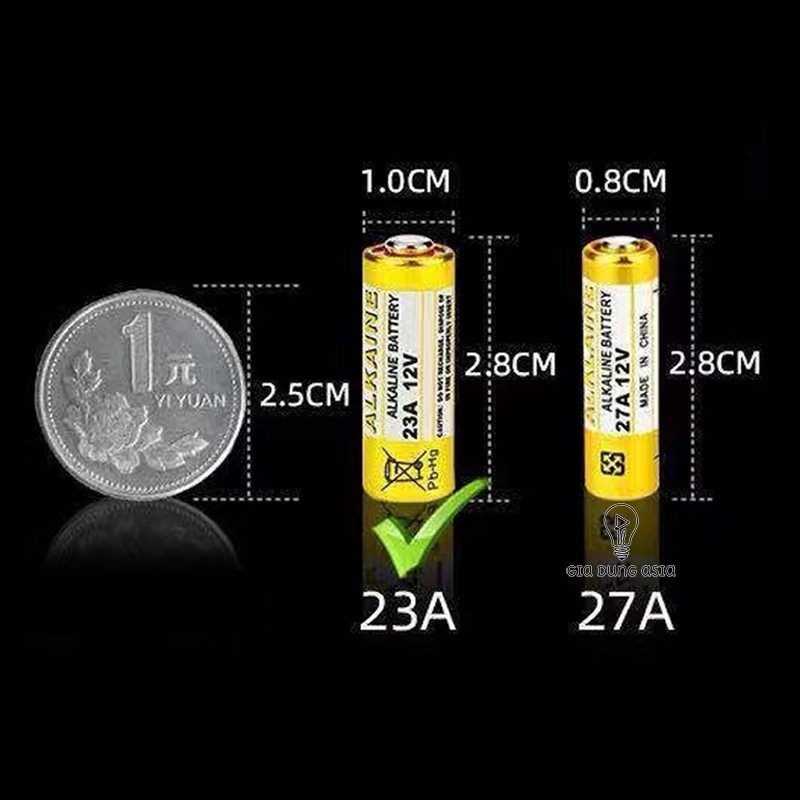 Kích thước: pin 23A: đường kính 10mm * dài 28mm, điện áp 12V