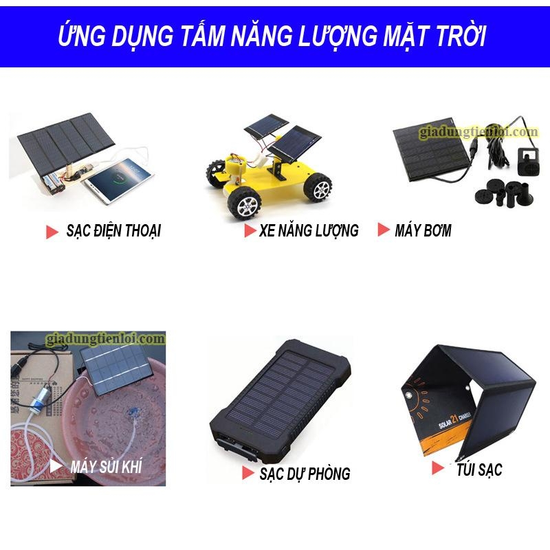 Shop Gia Dụng Asia cung cấp nhiều loại pin năng lượng mặt trời với điện áp khác nhau: 1V, 2V 3V và 6V ... đa dạng kích thước và công suất.